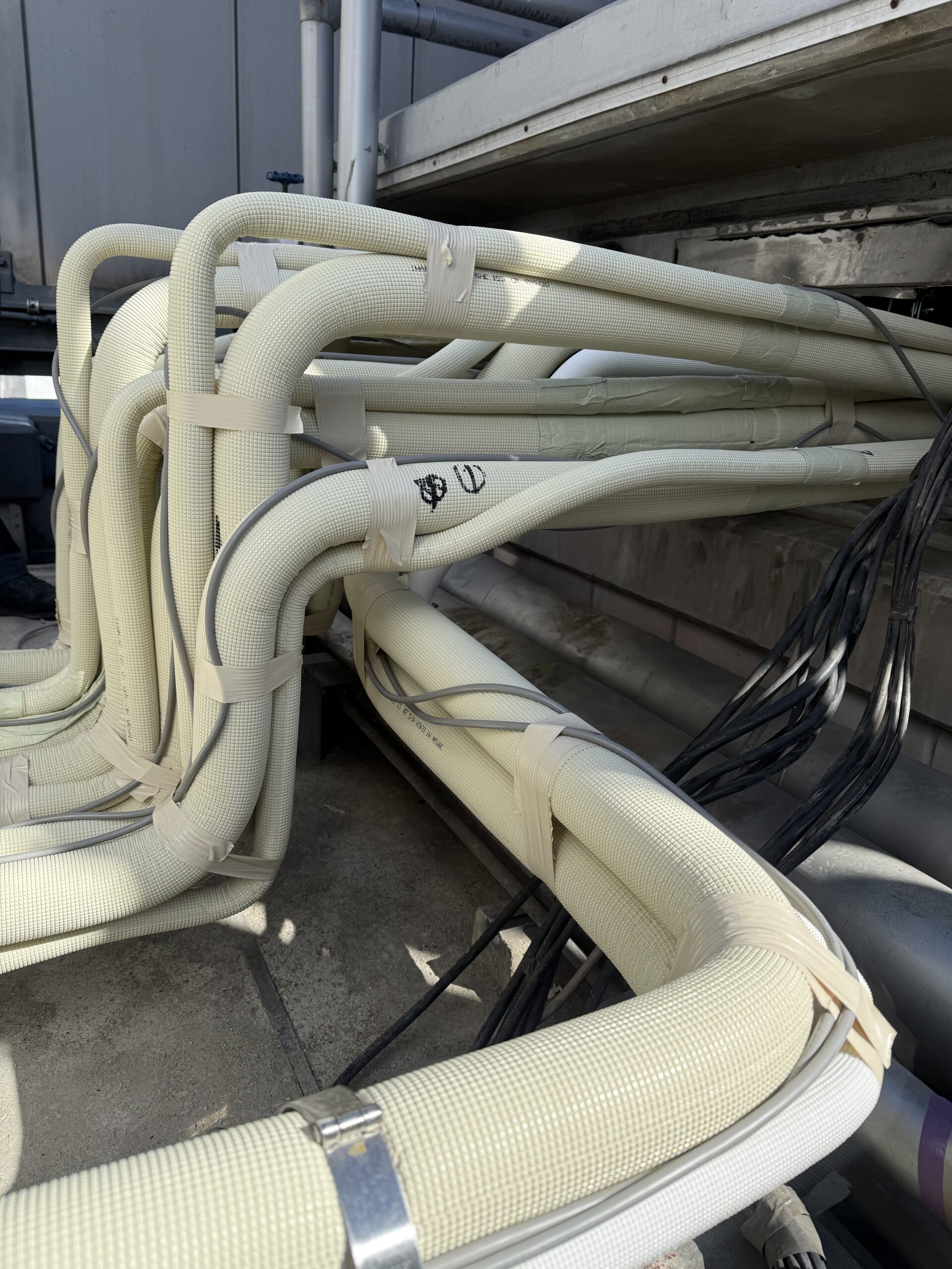 現地調査を行ったところ、配管の劣化や断熱材の損傷が見られ、冷媒漏れのリスクも高まっている状態でした。そのため、今回は既存配管を撤去し、新たにR32対応の冷媒配管を敷設することに。R32は従来の冷媒に比べて地球温暖化係数が低く、環境負荷が少ないのが特徴ですが、その分、施工にはより高い精度と注意が求められます。